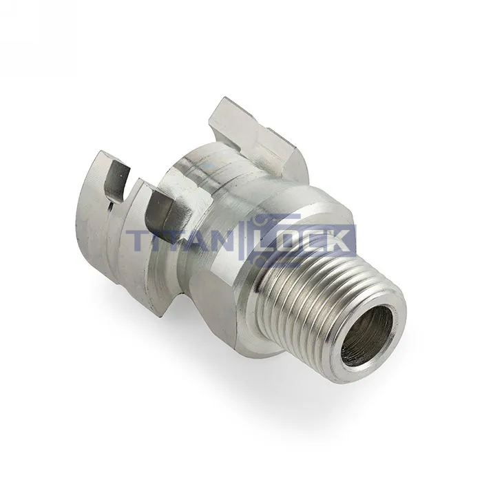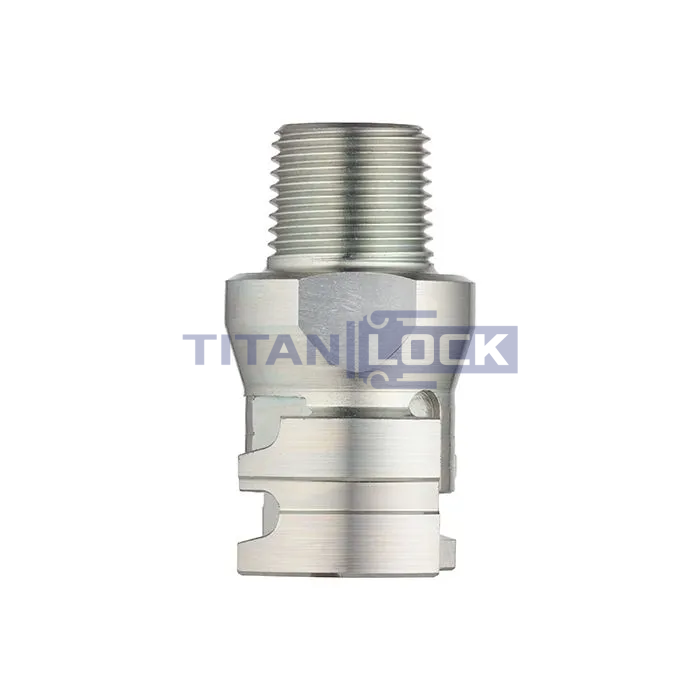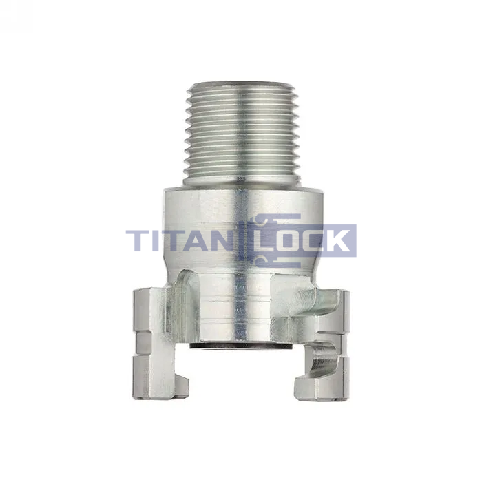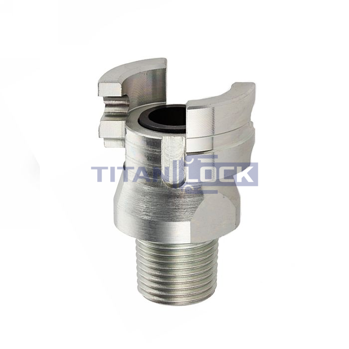 БРС серия P (Thor) TLPPM4 TITAN LOCK - это пневматическое соединение для передачи жидкостей, воздуха, воздуха с масляными вкраплениями и их производными. Соединение типа "ниппель" ("папа") с наружной резьбой NPT. Полная комплектация соединения представлена в качестве БРС серии P "папа" и БРС серии P "мама". Фиксация элементов происходит за счет шарикового затвора.