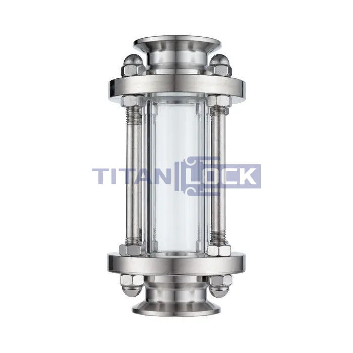 Состоит из термостойкого боросиликатного стекла цилиндрической формы, двух фланцевых частей под clamp, двух силиконовых уплотнений, установленных между стеклом и фланцами, а также шпилек, которыми стягиваются фланцы для предотвращения разрыва соединения под давлением.