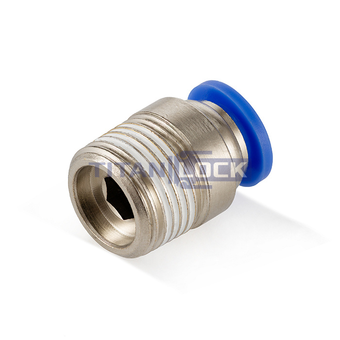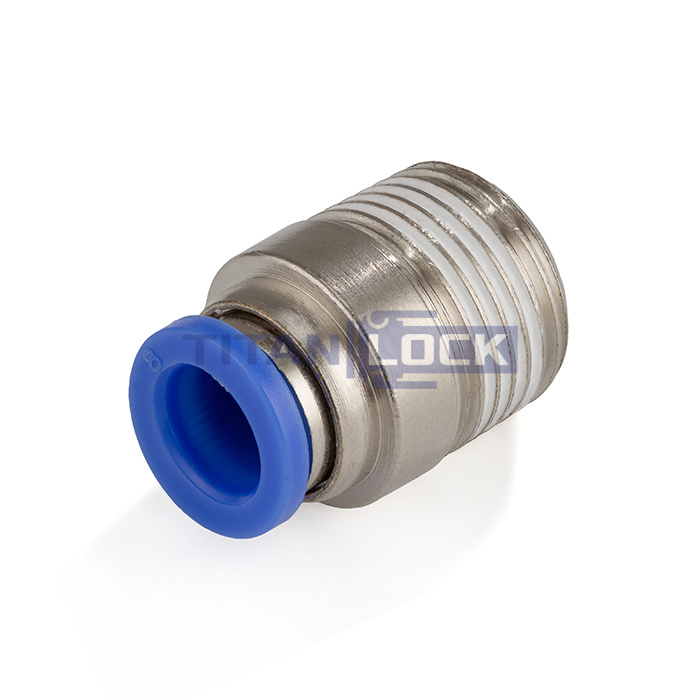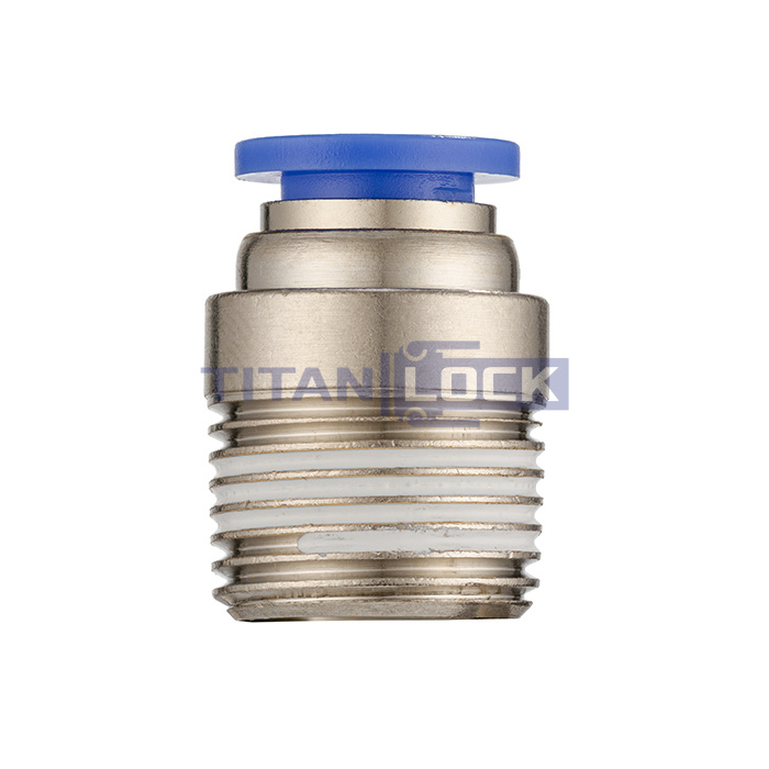Стальной пневматический фитинг TLP-POC6-01 TITAN LOCK серии PОC с наружной резьбой с одной стороны и с цанговым зажимом с другой стороны, предназначен для соединения пневматической трубки с пневматическим оборудованием или инструментами.