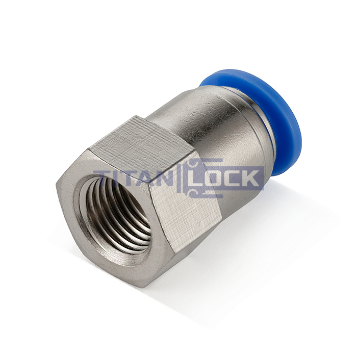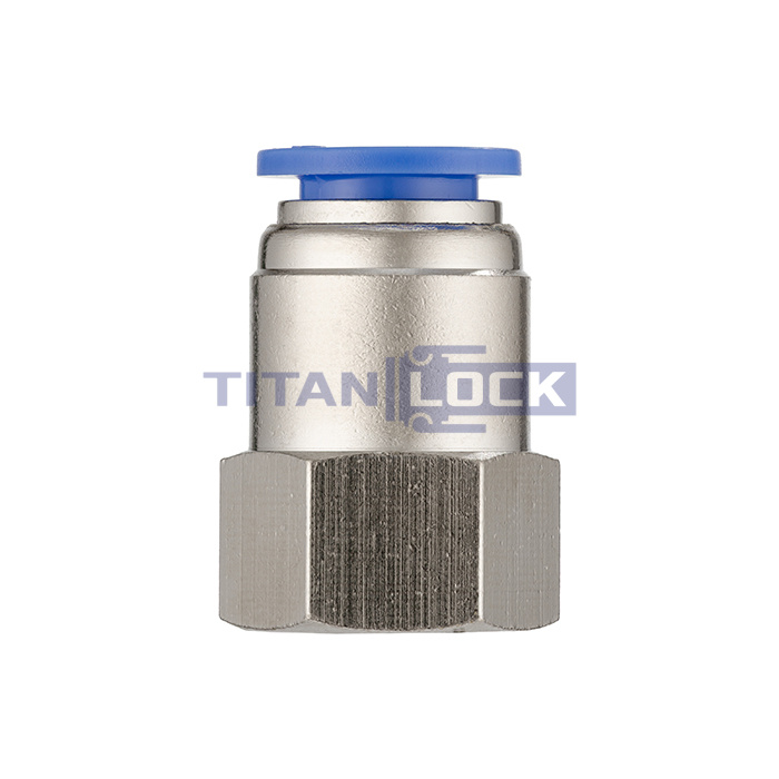 Стальной пневматический фитинг TLP-PCF8-01 TITAN LOCK серии PCF с внутренней резьбой с одной стороны и с цанговым зажимом с другой стороны, предназначен для соединения пневматической трубки с пневматическим оборудованием или инструментами.