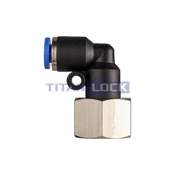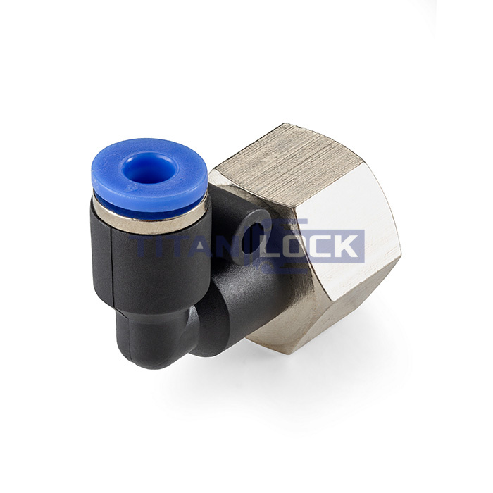 Фитинг угловой L-образный TLP-PLF8-02 TITAN LOCK с внутренней резьбой типа PLF имеет с одной стороны цанговое соединение, а с другой внутреннюю резьбу.