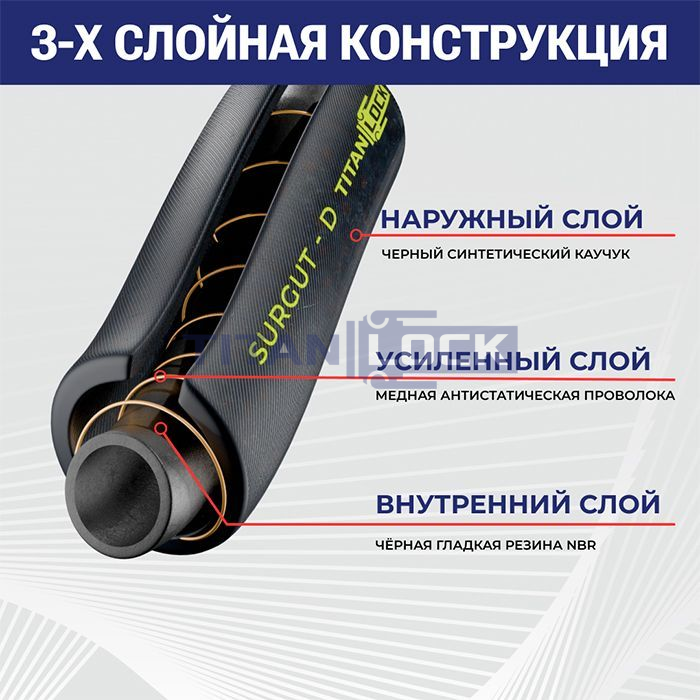 Маслобензостойкий напорный рукав SURGUT-D TL050SR-D TITAN LOCK изготовлен из резины NBR черного цвета.