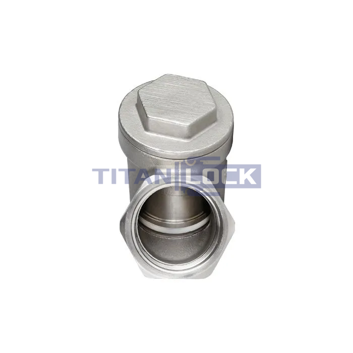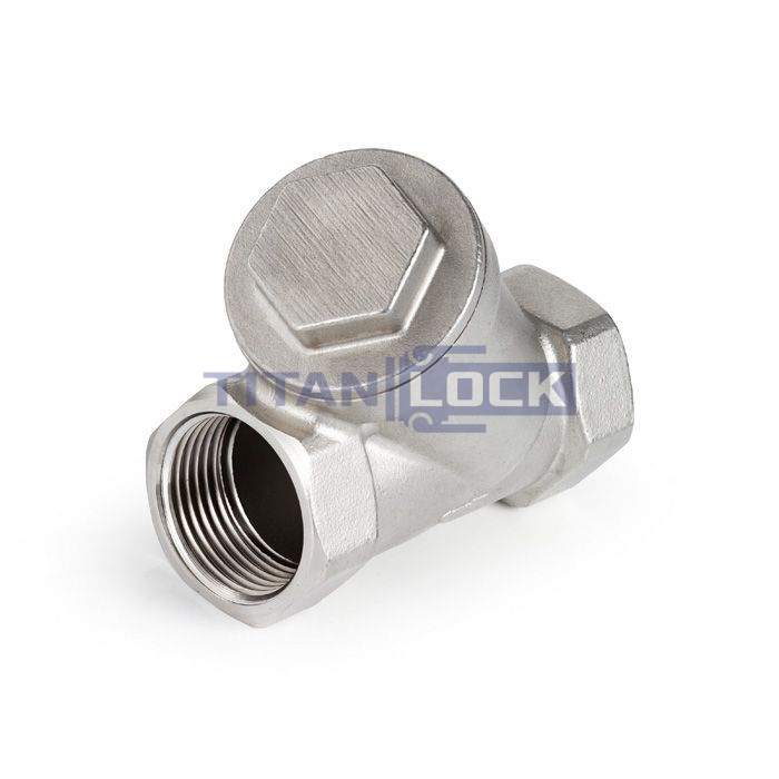 Обратный клапан У-образный нержавеющий TL2ACV TITAN LOCK - это элемент защитной трубопроводной арматуры предназначенный для предотвращения обратного потока жидкости в трубопроводе. Корпус имеет разборную конструкцию, что позволяет производить обслуживание без демонтажа. При снижении давления в системе запирающий диск под действием пружины прижимается к седлу не допуская обратного потока передаваемой среды, а уплотнения из PTFE обеспечивают герметичность.