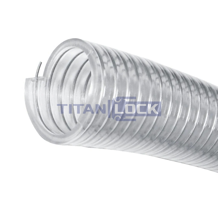 Изготовлен из прозрачного ПВХ, благодаря чему данный рукав используется на пищевом производстве, где требуется визуальный контроль. Усилен спиралью из стальной проволоки, повышающей прочность.