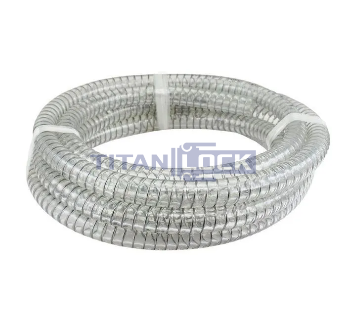 Изготовлен из прозрачного ПВХ, благодаря чему данный рукав используется на пищевом производстве, где требуется визуальный контроль. Усилен спиралью из стальной проволоки, повышающей прочность.