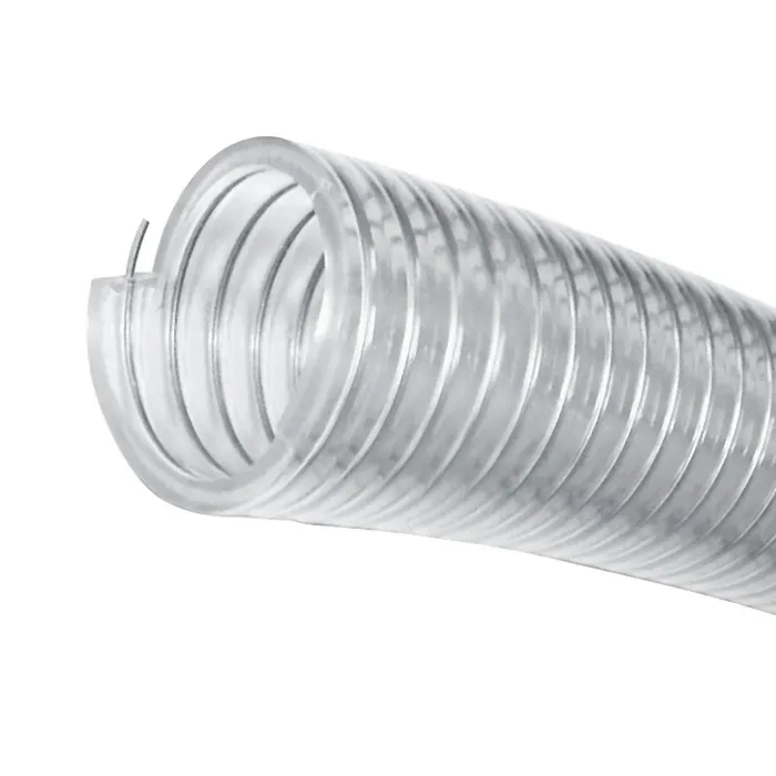 Изготовлен из прозрачного ПВХ, благодаря чему данный рукав используется на пищевом производстве, где требуется визуальный контроль. Усилен спиралью из стальной проволоки, повышающей прочность.