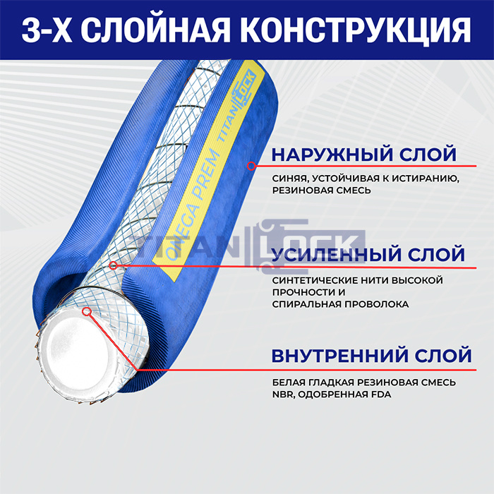 Пищевой рукав "ONEGA-PREM" TL050ON-PR TITAN LOCK относится к напорно-всасывающим рукавам и используется для транспортировки продуктов питания.