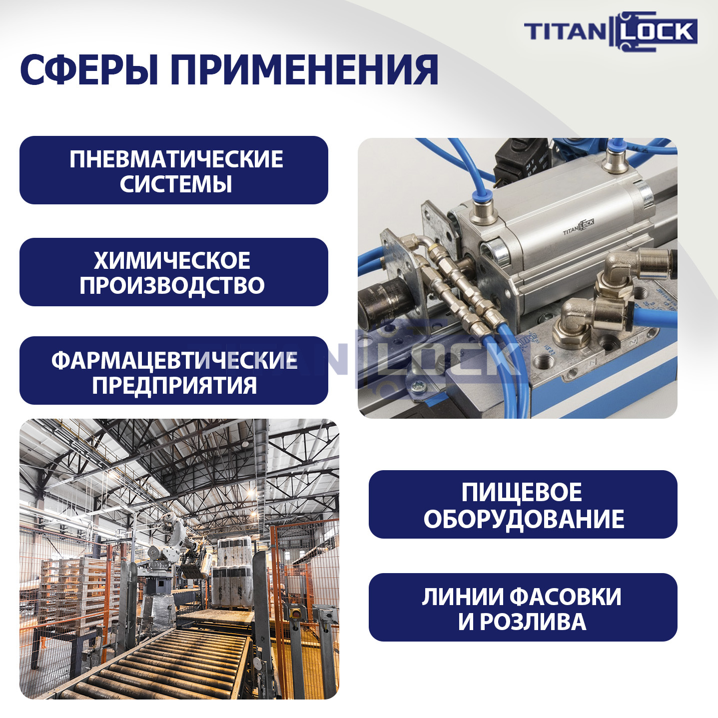 Пневматические цилиндры TITAN LOCK используются на пищевых, фармацевтических, химических производствах, линиях фасовки и розлива, а также в приводных механизмах, где управление идет по пневматической системе.
