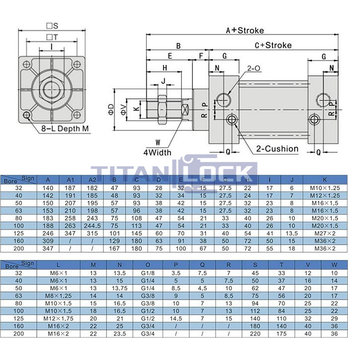 Пневматический цилиндр TLP-PC40X125SC TITAN LOCK серии SC – это пневмоцилиндр двустороннего действия с односторонним штоком.