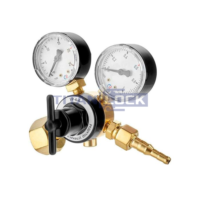 Редуктор для углекислого газа TLR54-CO2 TITAN LOCK выполнен в алюминиевом корпусе, на котором установлены два манометра для контроля входного и рабочего давления.