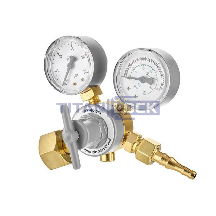 Регулятор аргоновый TITAN LOCK выполнен в алюминиевом корпусе, на котором установлены манометр и расходомер для контроля входного давления и рабочего расхода газа.