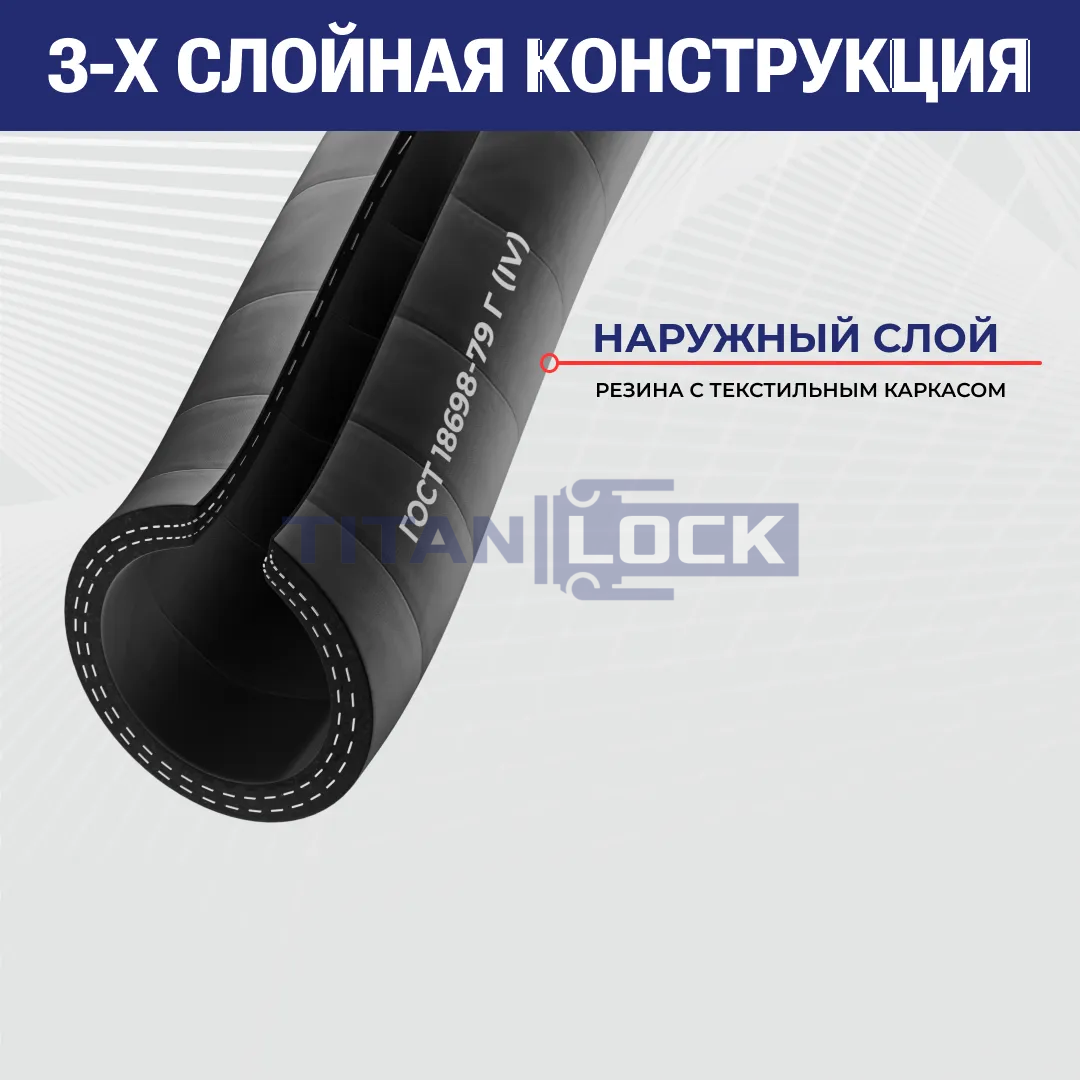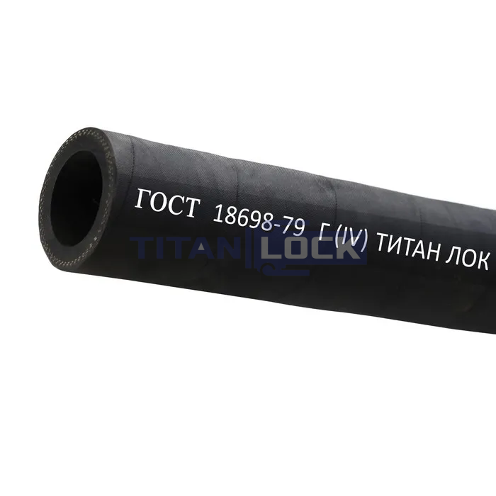 Резиновый рукав напорный TLGOST-G038 ТИТАН ЛОК класса Г (IV) с текстильным каркасом ГОСТ 18698-79 cостоит из внутреннего резинового слоя, нескольких слоев текстильного каркаса и наружного резинового слоя.