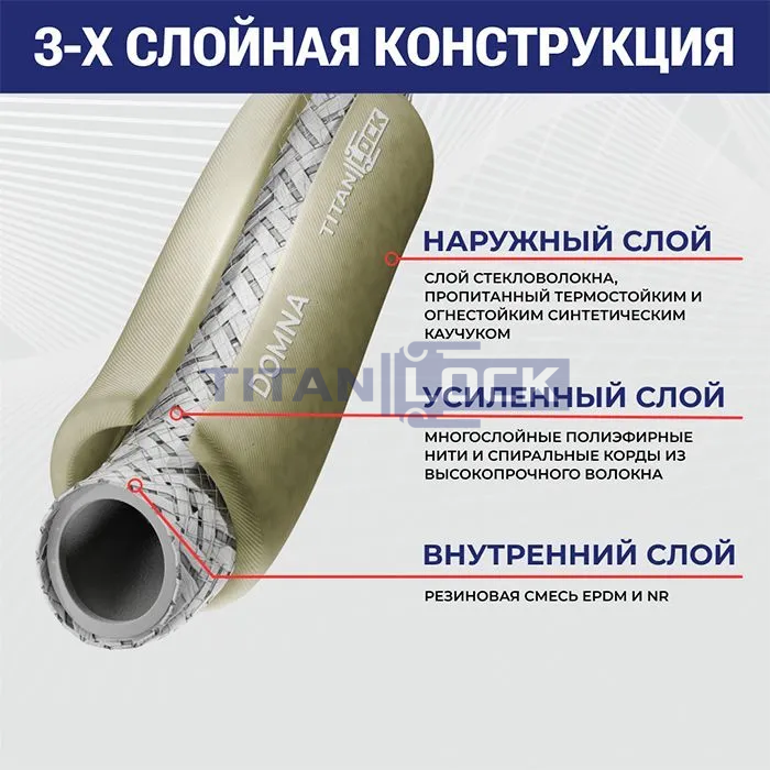 Рукав "DOMNA" производителя TITAN LOCK используется для подачи воды в системах охлаждения створок плавильных печей в сталелитейной, сталеплавильной, стекольной промышленности.