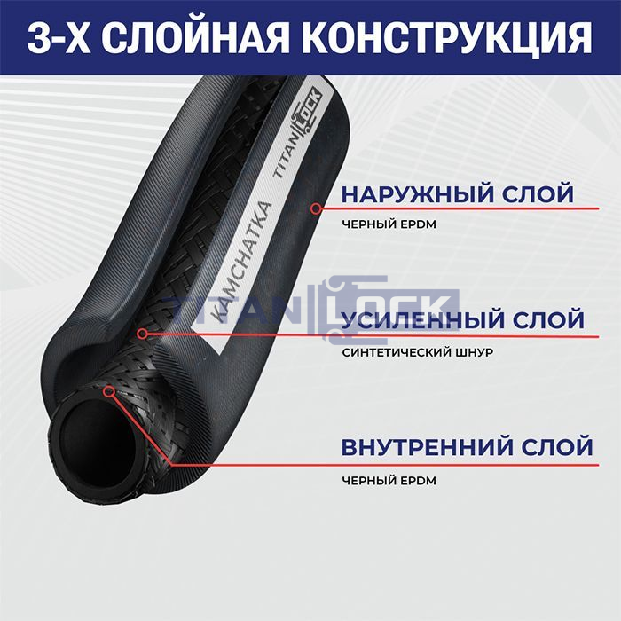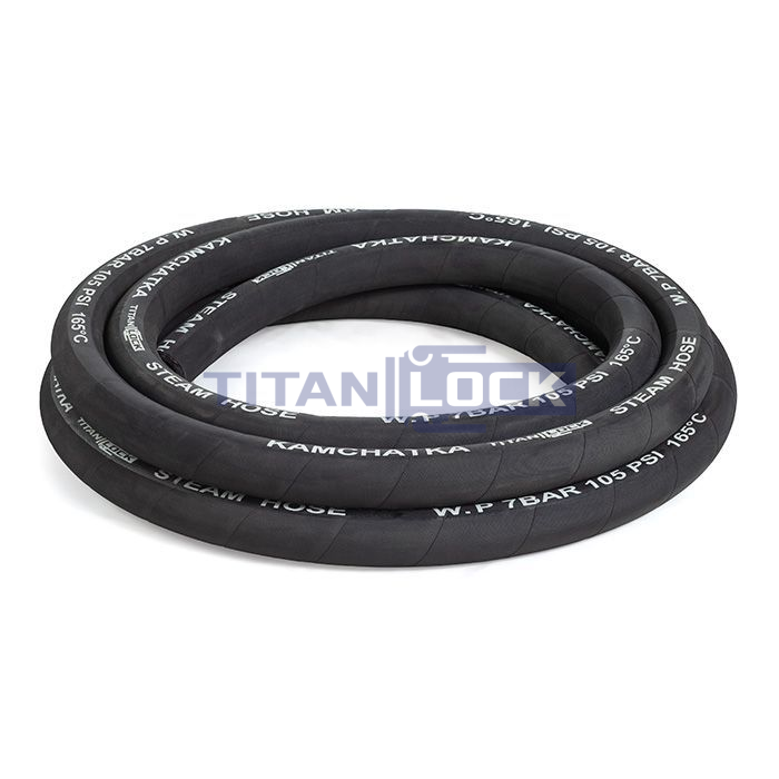 Рукав для пара и горячей воды KAMCHATKA TL016KT TITAN LOCK имеет наружный слой из черного EPDM. Армирован синтетическим кордом. Внутренний слой состоит из черного, гладкого, устойчивого к воздействию насыщенного пара EPDM. Имеет коэффициент прочности 1:10.