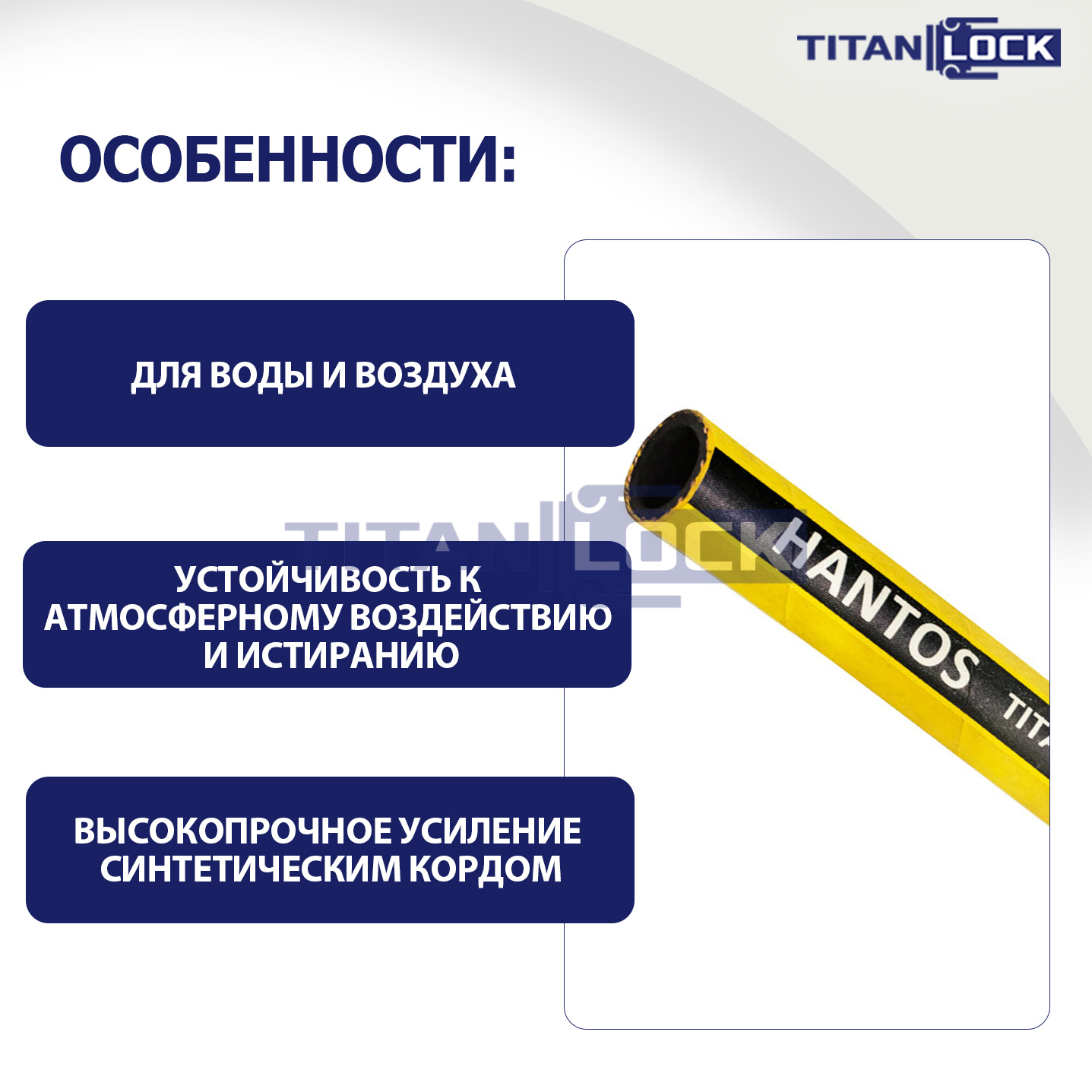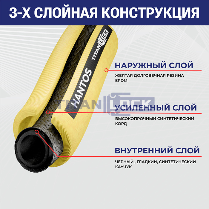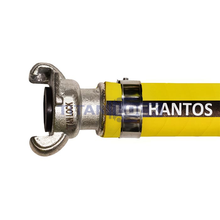 Напорный рукав "HANTOS" TL032HS TITAN LOCK используется для перекачки воды и сжатого воздуха. Подходит для пневмолиний, которые работают в условиях повышенного трения - при дорожно-строительных работах, на карьерах, в коммунальном хозяйстве и т.д.