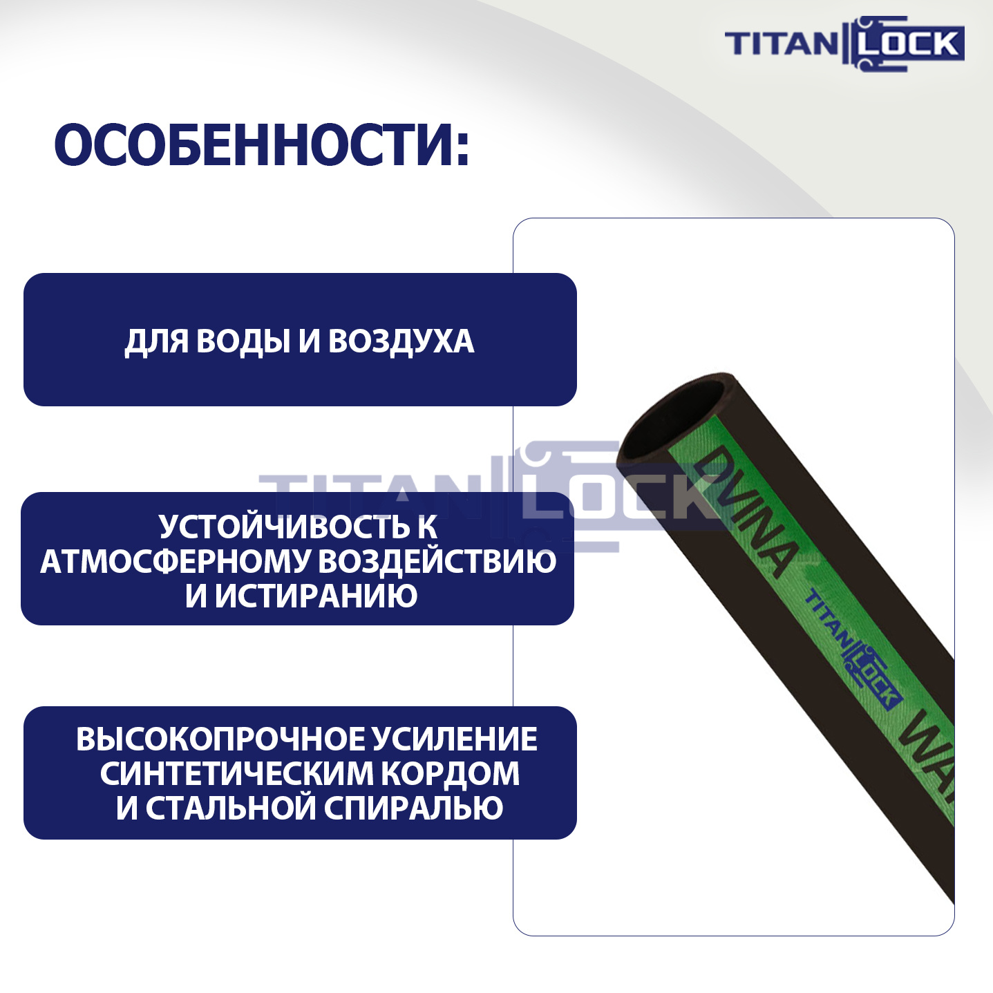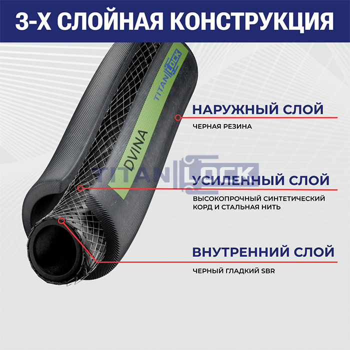 Напорно-всасывающий рукав "DVINA" TL100DV TITAN LOCK применяется для подачи и всасывания воды, водных смесей, воздуха. Используется в промышленности в центробежных и диафрагменных насосах, мотопомпах, в коммунальных машинах и строительстве.