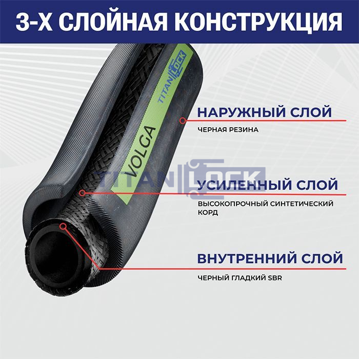 Напорный рукав " VOLGA" TL076VG TITAN LOCK используется для перекачки воды и воздуха. Подходит для сфер промышленности, где требуется транспортировка воды и воздуха при достаточно высоком давлении и на большие расстояния - в коммунальной сфере, на объектах строительства, карьерных разработках и т.п.