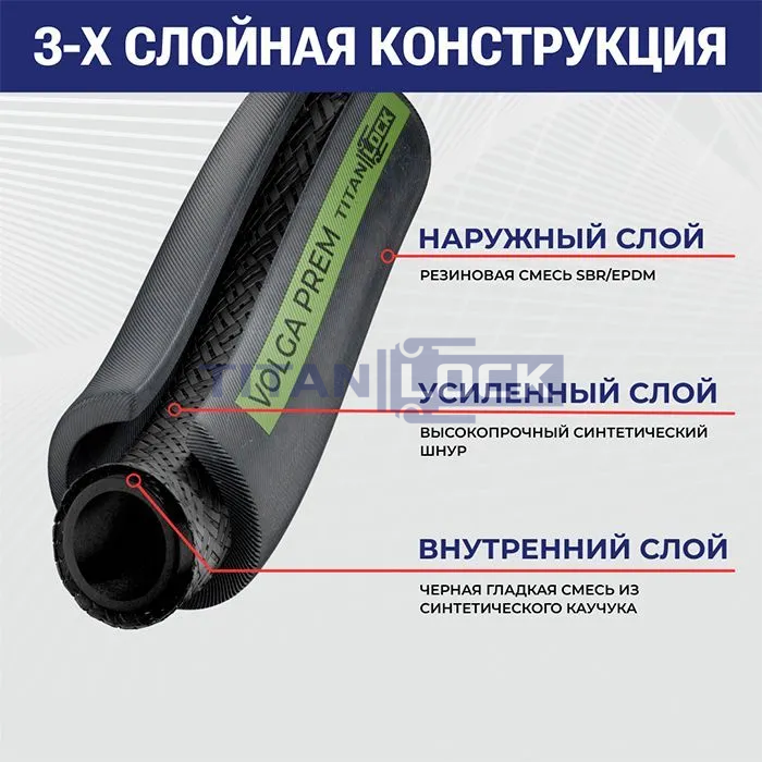 Рукав для воды VOLGA-PREM TL063VG-PR TITAN LOCK имеет черный наружный слой из смеси SBR и каучука EPDM, армирование выполнено многослойным текстильным кордом из синтетики. Внутренний слой изготовлен из резины SBR черного цвета.