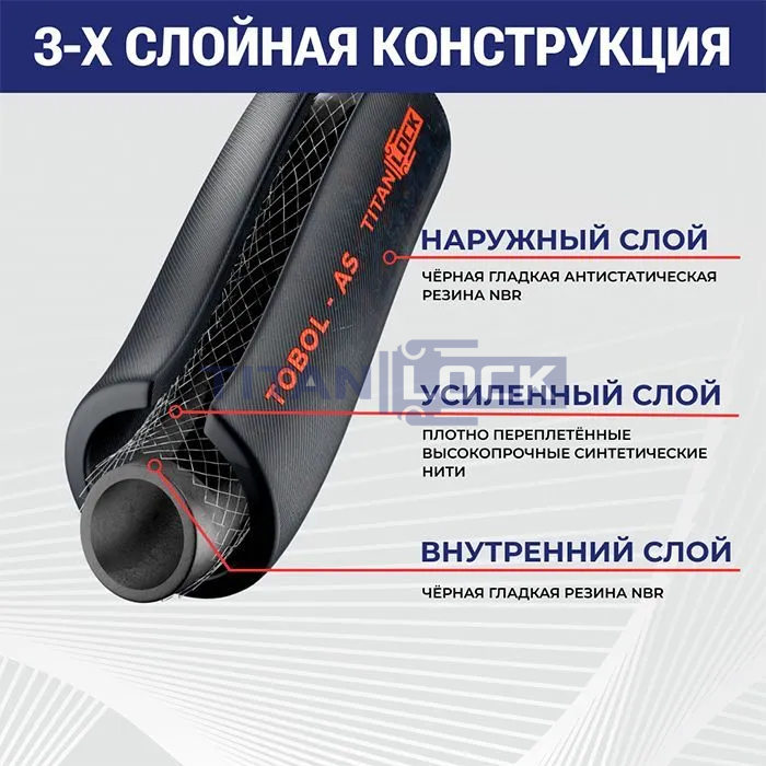 Маслобензостойкий антистатический рукав TL016TB-AS TITAN LOCK является напорным и предназначен для перекачивания гидравлического масла, смазок, нефтепродуктов и других типов жидкостей.