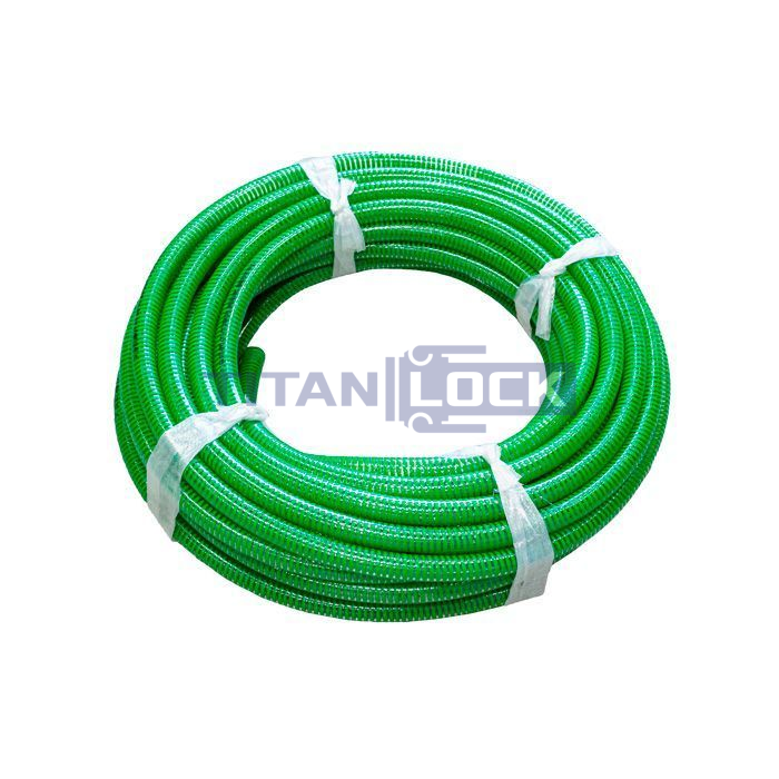 Рукав ПВХ для систем полива и сельхозработ производителя KROKUS TL100KK TITAN LOCK состоит из слоя прозрачного ПВХ и усиления в виде зеленой ПВХ спирали. Наружная поверхность рукава гладкая.