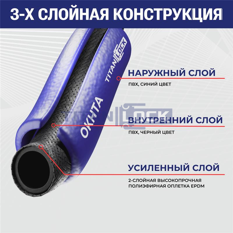 Шланг для компрессоров OKHTA TL016OH TITAN LOCK состоит из наружного слоя ПВХ синего цвета и внутреннего слоя ПВХ черного цвета. Армирование выполнено полиэфирной высокопрочной двухслойной оплеткой.