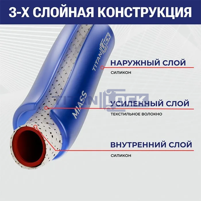 Напорный силиконовый шланг MIASS TL016MS TITAN LOCK изготовлен из 100% силикона, внутренний слой красного цвета, наружный слой синего цвета.