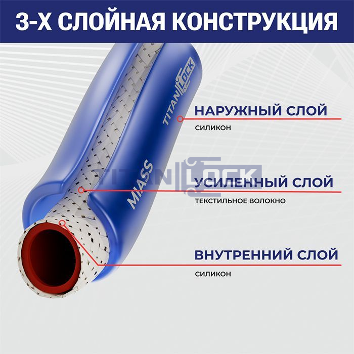 Напорный силиконовый шланг MIASS TL032MS TITAN LOCK изготовлен из 100% силикона, внутренний слой красного цвета, наружный слой синего цвета.
