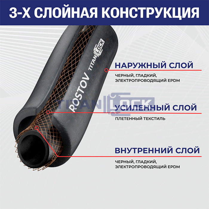 Многофункциональный рукав ROSTOV TL006RV TITAN LOCK с внутренним слоем из EPDM представляет собой очень гибкий, универсальный рукав с хорошей стойкостью к истиранию и атмосферному воздействию.