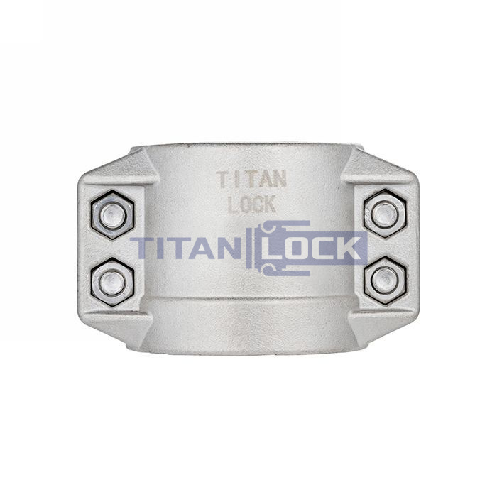 Четырехболтовый хомут TL150X12AL TITAN LOCK состоит из двух частей, которые соединяются и зажимаются между собой четырьмя болтами.